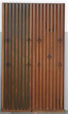 Sistema appendiabiti da parete in legno ad angolo con grucce in metallo. Produzione Cantieri Carugati, Rovellasca, Italia, 1958 ca. (un modulo cm 275x84x10) (difetti)