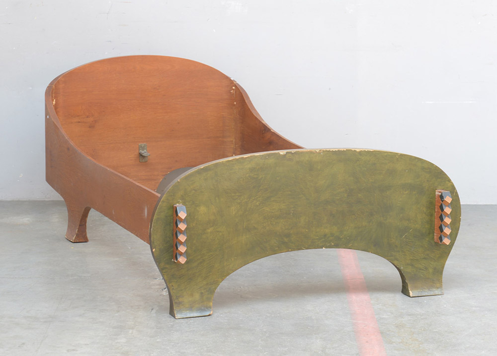 Enrico Castiglioni Busto Arsizio 1914 Busto Arsizio 2000 Letto singolo con struttura a barca, in legno massello e impiallacciato, naturale e tinto in nero e verde all'anilina con motivi a incastro di gusto Neoliberty. Italia, 1958 ca. (cm 94x73x210) (difetti) Provenienza: Collezione privata, Busto Arsizio