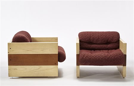 Coppia di poltrone in legno massello bicolore con cuscini poggiaschiena e sedute rivestiti in tessuto marrone, piedini in plexiglass. Produzione italiana, anni 70 (cm 77x56,5x77) (difetti)