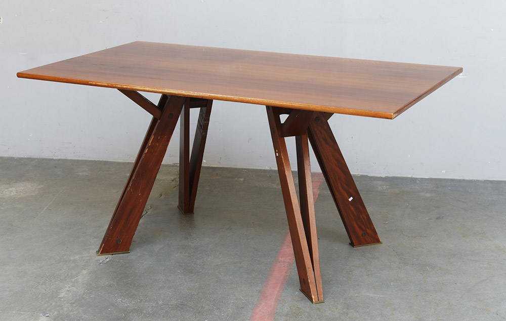 Tavolo in legno massello e impiallacciato con piano rettangolare e struttura a quattro gambe divaricate con puntali in ottone. Italia, anni 80-90 (cm 150x74x80)(difetti)