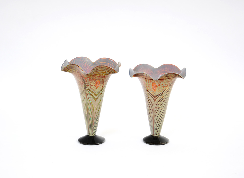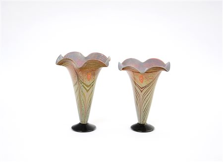 Coppia di vasi in vetro color oro con base in vetro ametista scuro (h max cm 24)