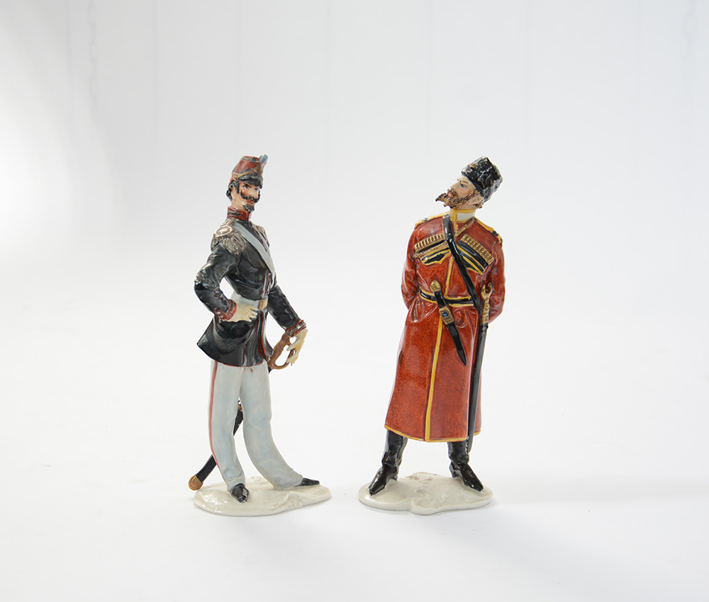 Guido Cacciapuoti Napoli 1892 Milano 1953 S. Righetto "Gendarmi" lotto composto da due statuine in ceramica policroma. Sec XX (h cm 21) (lievi difetti)
