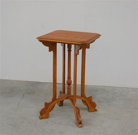 Tavolino di gusto Arts & Crafts, con piano ottagonale in legno massello di rovere intagliato e ripiano estraibile. Produzione centroeuropea, inizi sec XX (cm 47x76x47) (lievi difetti)