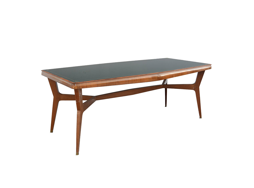 Tavolo da pranzo in legno di palissandro indiano impiallacciato e massello, con struttura alla maniera di Ico Parisi, con correnti a X puntali in ottone e piano in vetro verde decorato a dorature (cm 210x80x98) (lievi difetti)