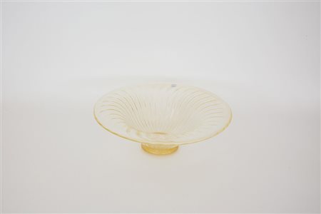 Stefano Toso, Murano. Alzata costolata in vetro incolore con inclusione di foglia d'oro. Anni 80/90. Firmata a punta alla base (h. cm 14 x d. cm 41)