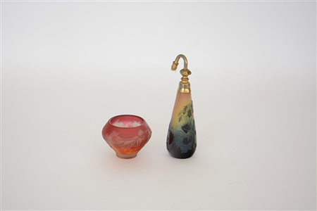 Gallé, Nancy Lotto composto da un portaprofumi e da una ciotola in vetro cammeo a più strati corroso all'acido nei toni dell'arancio, del bianco opalescente, del vinaccia, del blu, del verde e del giallo con decori vegetali. Inizi del sec XX (h cm 20 e h cm 6,5) (lievi difetti)