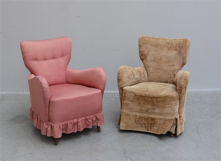 Lotto composto da due poltroncine da camera con gambe inflesse in legno di teak e rivestimento in velluto beige e in seta rosa. Italia, sec XX (difetti)
