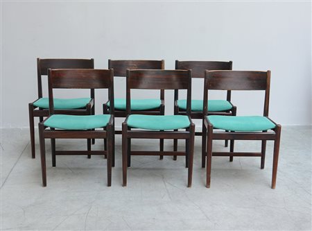 Arne Vodder 1926 2009 Lotto composto da sei sedie in palissandro indiano, seduta rivestita in alcantara verde. Produzione Sibast Furniture, Danimarca, anni 60 (cm 51x81x45)(difetti e restauri)