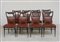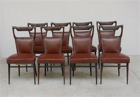 Osvaldo Borsani (attr.) Lotto composto da otto sedie in legno di noce tinto con schienale e seduta rivestita in skai marrone. Varedo, anni 50 (cm 48x98x42) (difetti)