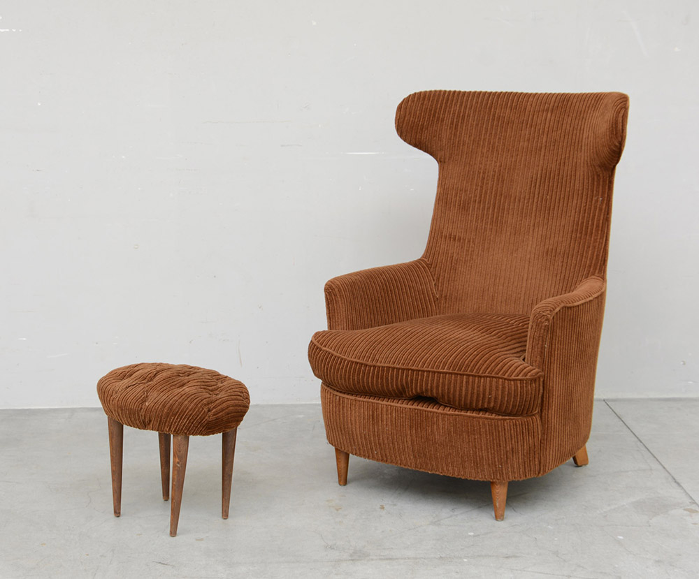 Poltrona imbottita con struttura in legno e rivestimento in velluto a coste marrone. Unita a un poggiapiedi analogo. Italia, anni 50 (lievi difetti)