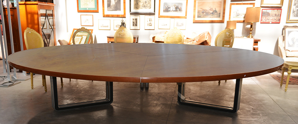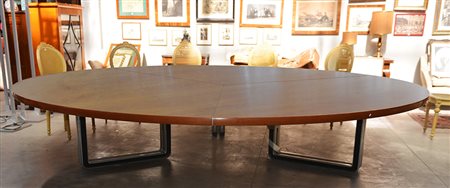Grande tavolo da riunione circolare con piano impiallacciato in legno e otto gambe in fusione di alluminio e supporti in acciaio. Produzione Tecno, Varedo, su misura. Anni 70 ca. (cm 378x71x378) (difetti)