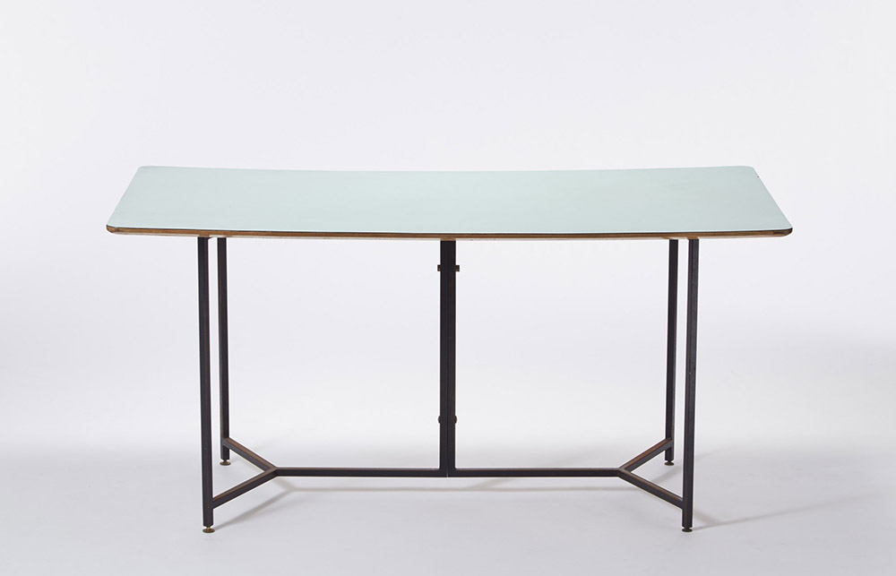 Tavolo con struttura in metallo verniciato nero e piano in legno e laminato verde. Italia, anni 60 (cm 160x78x80) (difetti)