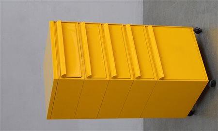 Simon Fussel Mobile portadocumenti in plastica gialla a cinque cassetti su ruote modello "4601 3-5". Produzione Kartell, anni 70 (cm 41,5x96x44) (lievi difetti)