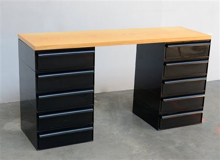 Simon Fussel Scrivania modello "4601 3-5". Produzione Kartell, anni 70. Struttura in plastica a due colonne con cinque cassetti, piano impiallacciato in legno chiaro (cm 140x73x43) (lievi difetti)