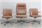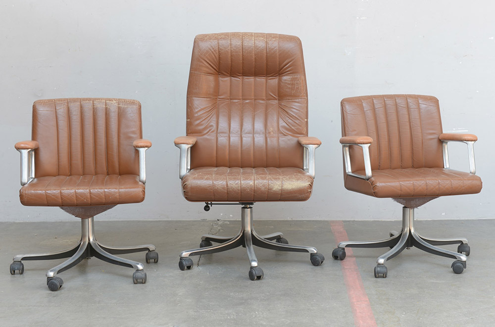 Lotto composto da due poltroncine e una poltrona girevoli in pelle marrone. Produzione Tecno, Varedo, anni 70 (difetti)