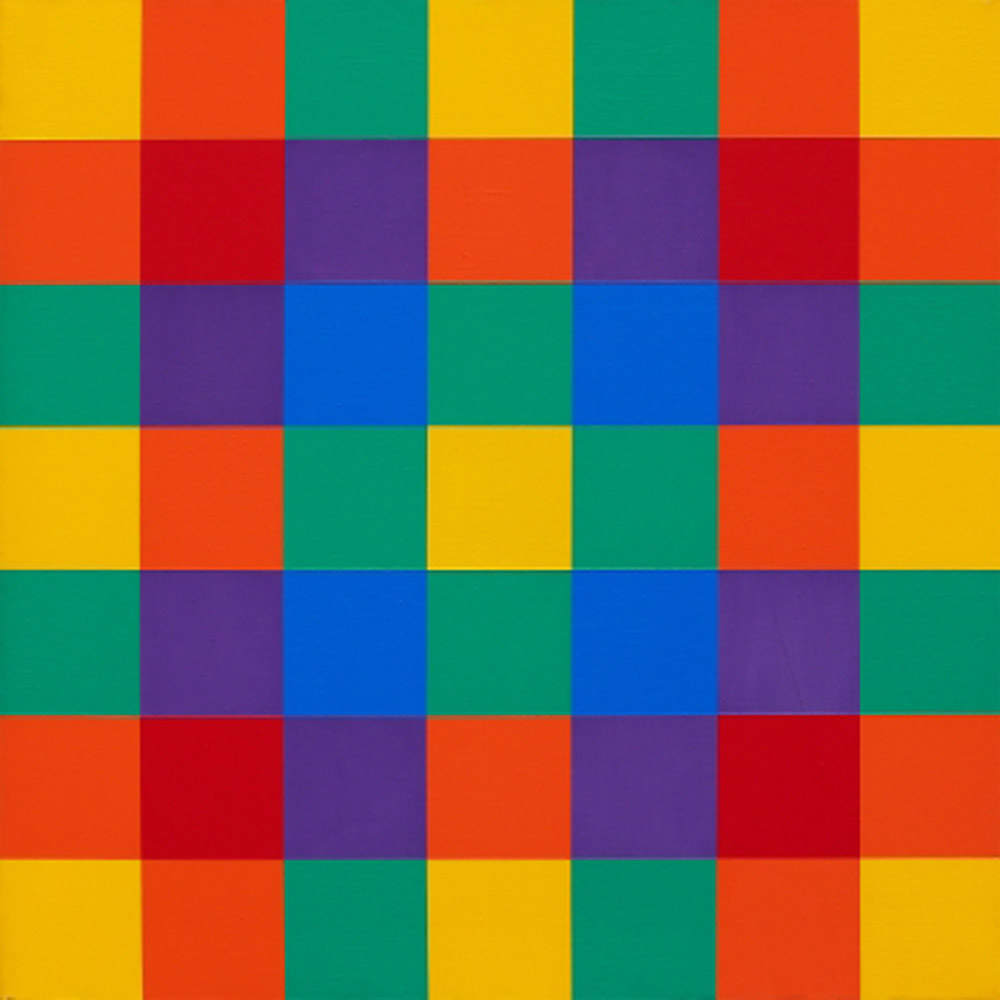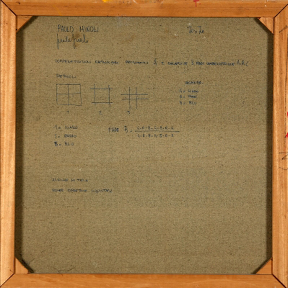 PAOLO MINOLI 1942 – 2004 Compenetrazioni regolari programma A e relative tre fasi combinatorie A.B.C., anni ‘70 Acrilico su tela, cm. 70 x 70 Firmato sul retro Prov. Collezione Privata