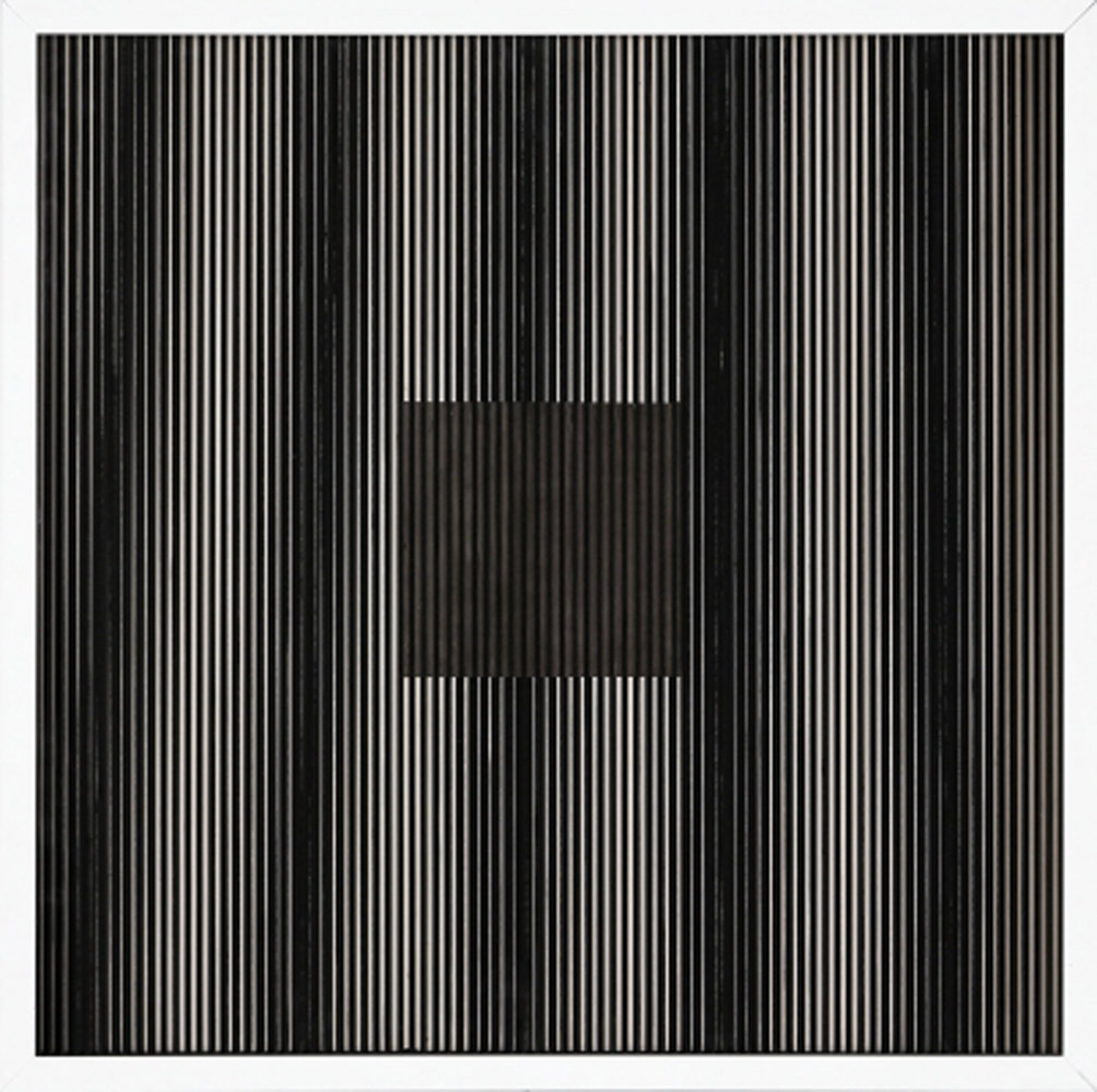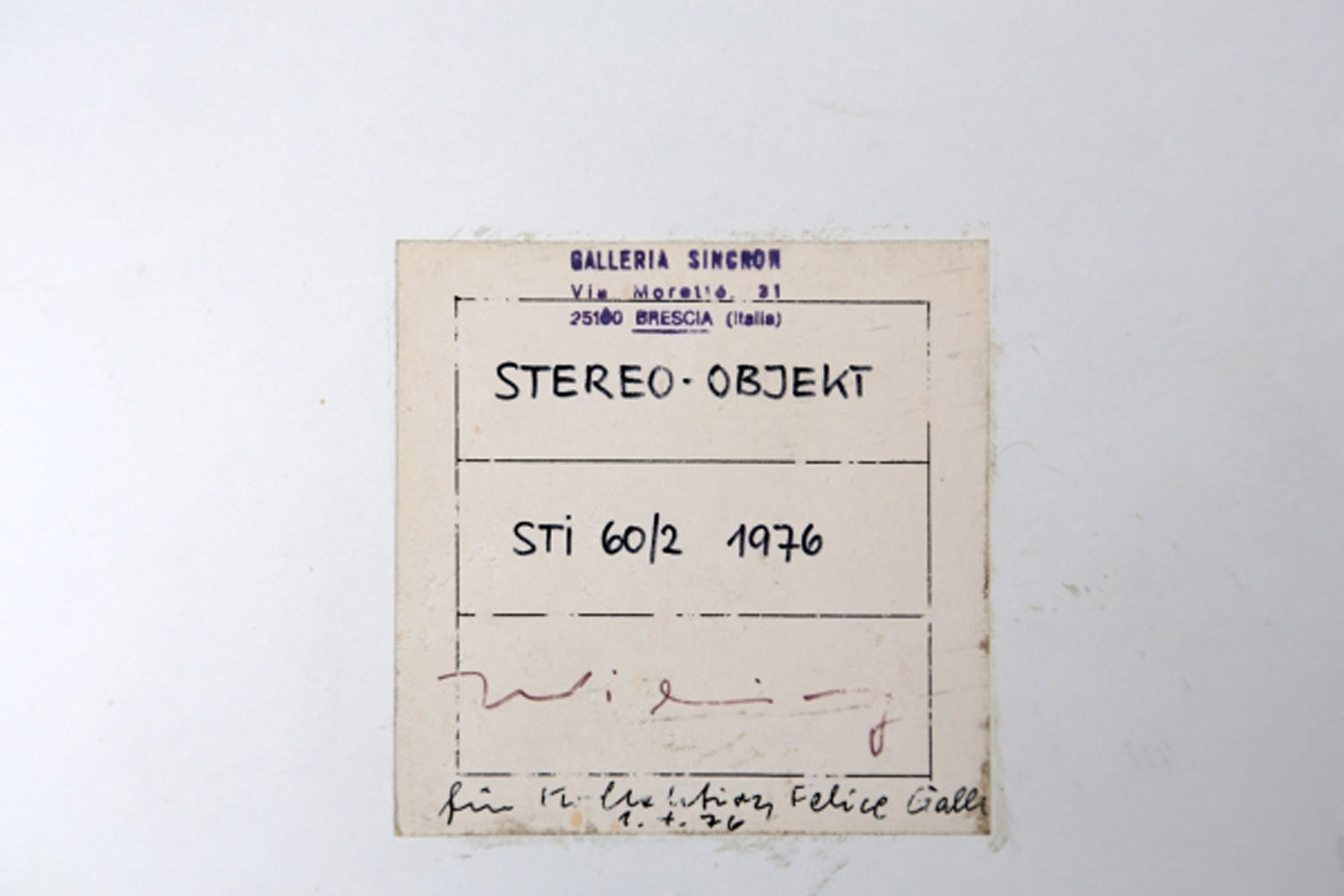 LUDWIG WILDING 1927 - 2010 Stereo objekt stee 60/2, 1976 Assemblaggio, lamelle elastiche e collage di cartone su tavola, cm. 60,5 x 60,5 x 6 Firmato e datato sul retro Timbro Galleria Sincron, Brescia sul retro Dedica dell’artista sul retro Prov. Collezione Privata