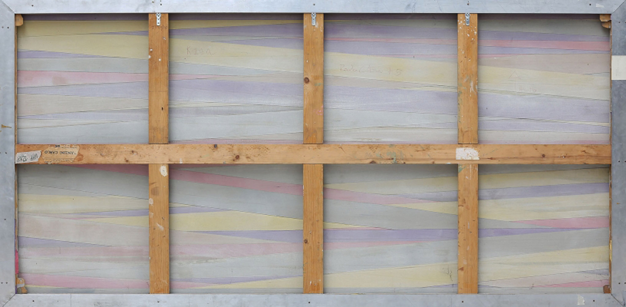 PAOLO COTANI 1940 – 2011 Bende elastiche + colore, 1975 Acrilico su bende elastiche, cm. 150 x 300 Firmato e datato sul retro PUBBLICAZIONI: “Pittura Analitica”, Fondazione VAF, Silvana Editoriale, 2008, p. 99 Prov. Collezione Privata