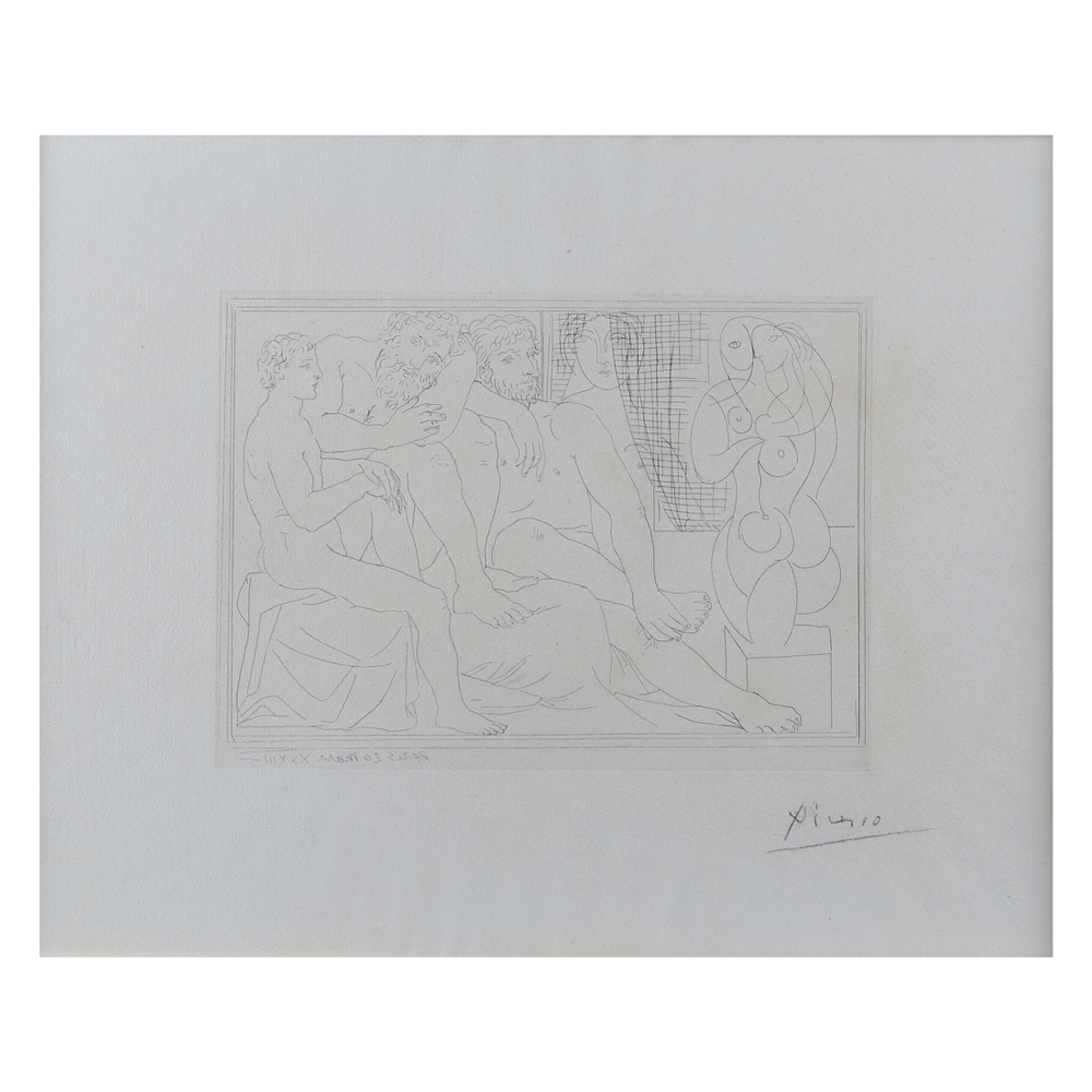 Pablo Picasso Malaga 1881 - Mougins 1973 19x26,5 cm. "Sculpteurs, Modelés et sculpture", tratto da La Suite Vollard, acquaforte su carta vergata, 1933, firmata in basso a destra, entro cornice