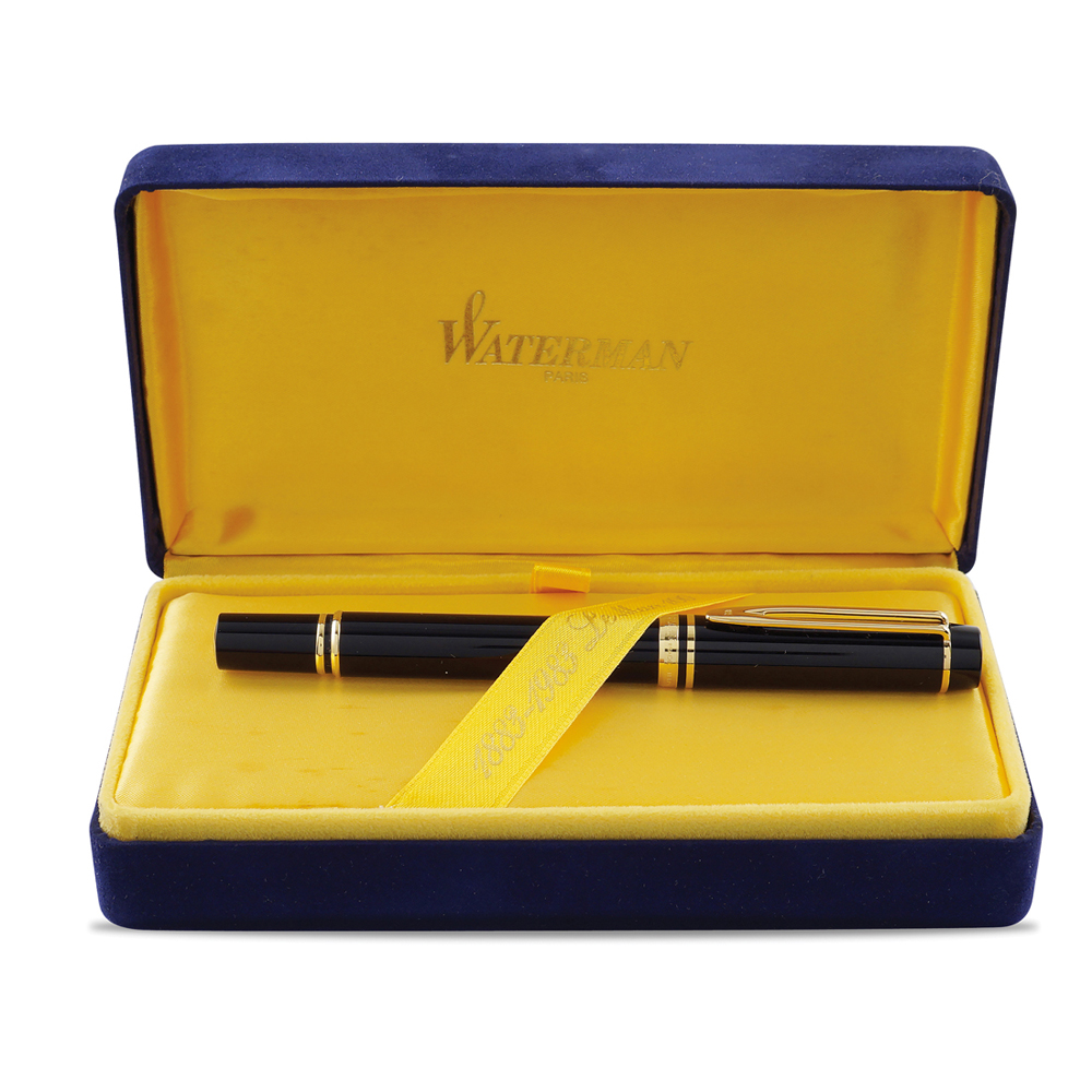 Waterman, Le Man 100 vintage l. 14,5 cm. penna stilografica a stantuffo con pennino in oro 18kt, serbatoio e cappuccio in resina nera, clip e anelli placcati in oro. Completa di scatola originale e garanzia