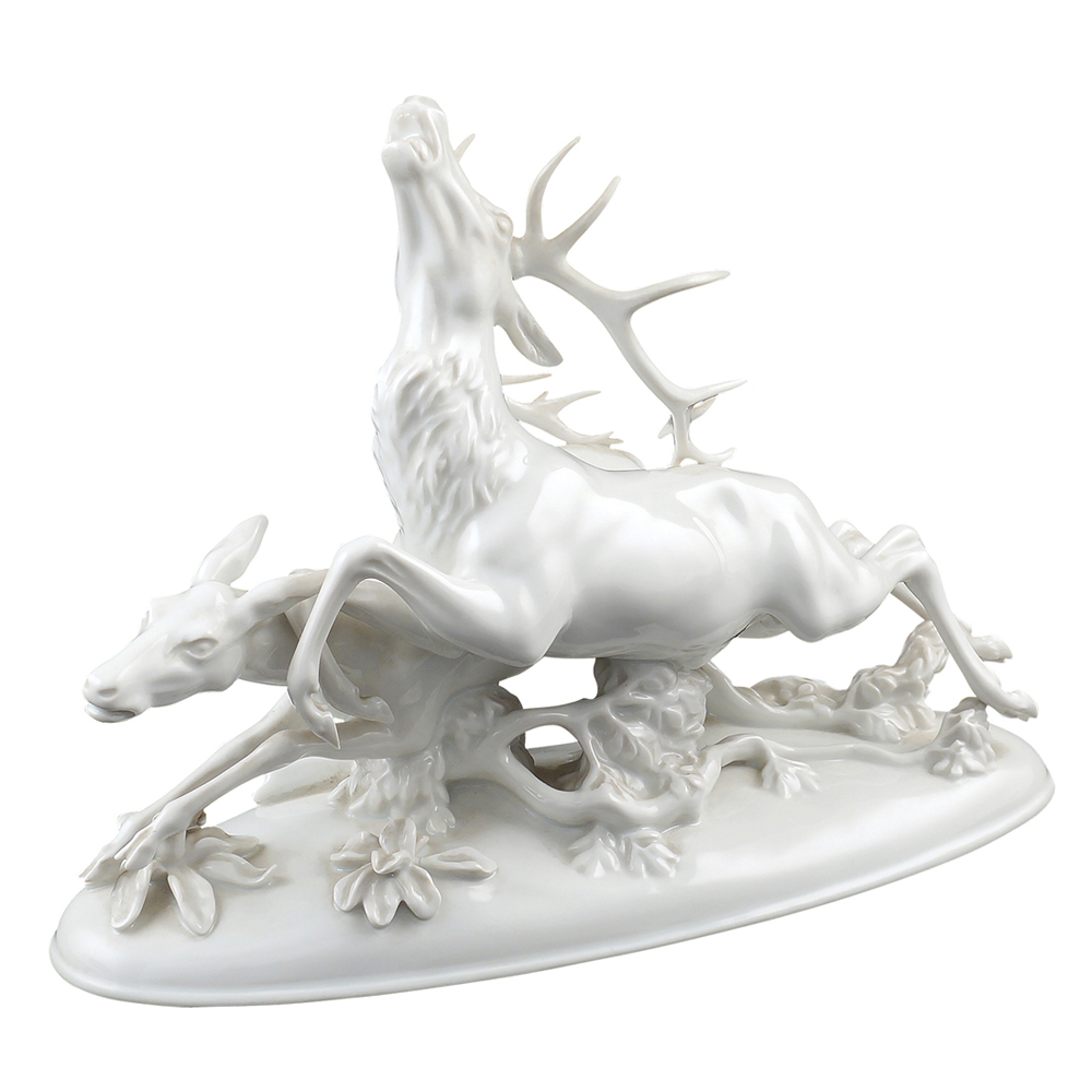 Gruppo in porcellana bianca Vienna, XX Sec. 20x28x10,5 cm. raffigurante una coppia di cervi poggiante su base ovale, marchio sotto la base