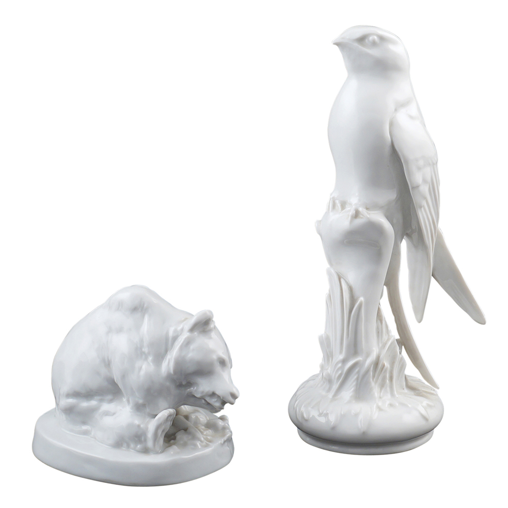 Meissen, due sculture in porcellana bianca Germania, XX Sec. h. 9 - 20 cm. raffiguranti una rondine e un orso bruno, marchio sotto le basi