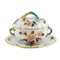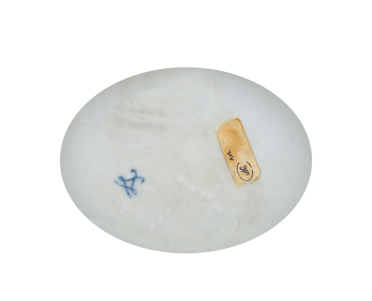 Salsiera con piattino in porcellana Sevres Francia, inizio XX Sec. 14x21x17 cm. forma ovale a due manici con coperchio, dipinta in policromia su fondo bianco e parzialmente dorata