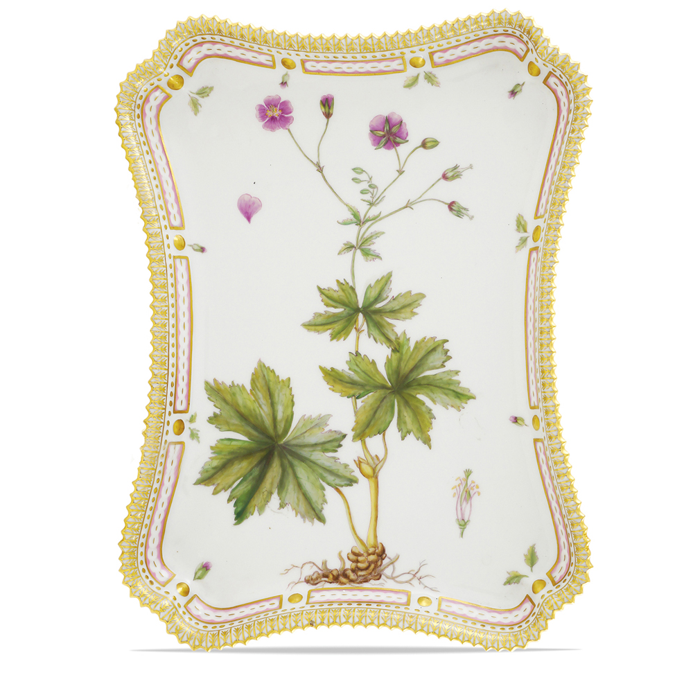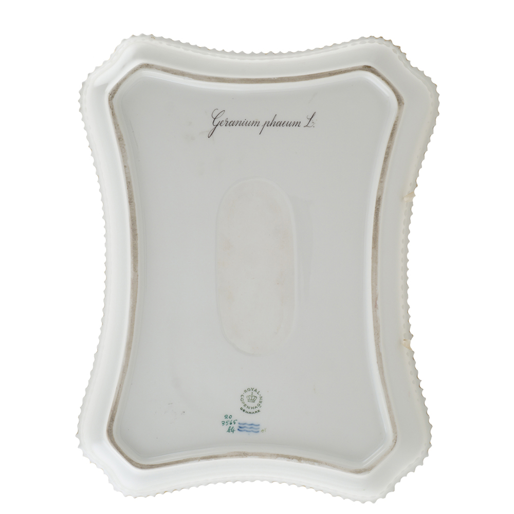 Vassoio in porcellana Royal Copenaghen metà XX Sec. 3,5x29,5x23 collezione "Flora Danica", di forma rettangolare con bordo sagomato, dipinto in policromia e parzialmente dorato, marchio sul retro
