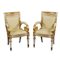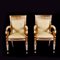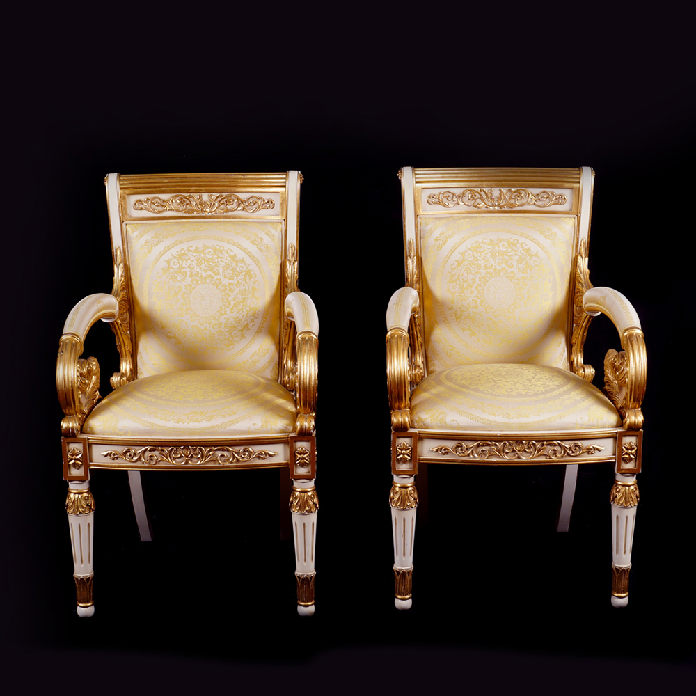 Gianni Versace home anni '90 92x50x56 cm. due poltrone modello Vanitas, struttura in legno di faggio intagliato a mano con motivi vegetali, finitura laccata avorio e foglia d'oro, sedute e schienali rivestiti in tessuto collezione Versace Medusa, finitura in lacca avorio e foglia d'oro, lievi usure