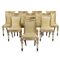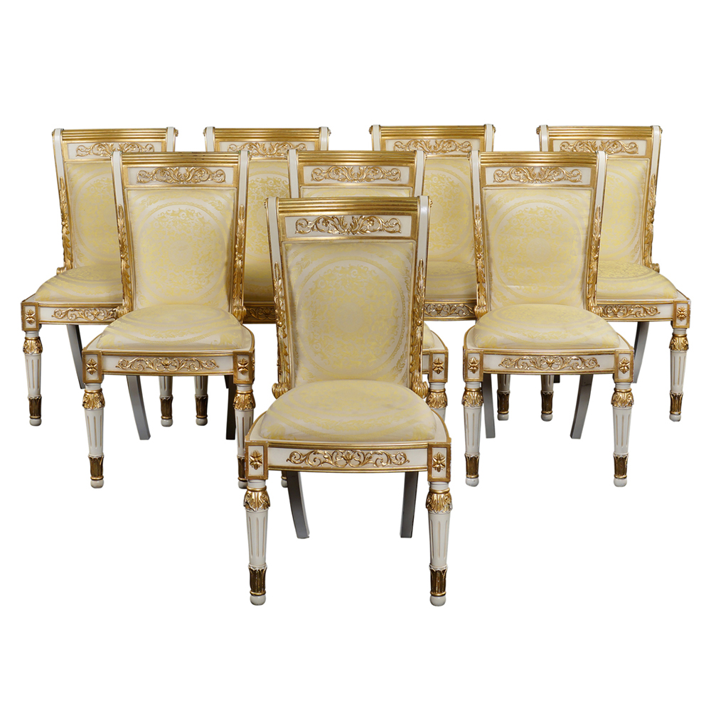 Gianni Versace home anni '90 92x50x49 cm. otto sedie modello Vanitas, struttura in legno di faggio intagliato a mano con motivi vegetali, finitura laccata avorio e foglia d'oro, sedute e schienali rivestiti in tessuto modello Versace Medusa, lievi usure