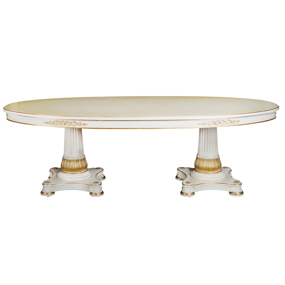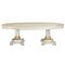 Gianni Versace home anni '90 80x250x120 cm. tavolo ovale da pranzo modello Vanitas, struttura in legno di faggio intagliato a mano con motivi vegetali, finitura laccata avorio e foglia d'oro, lievi usure
