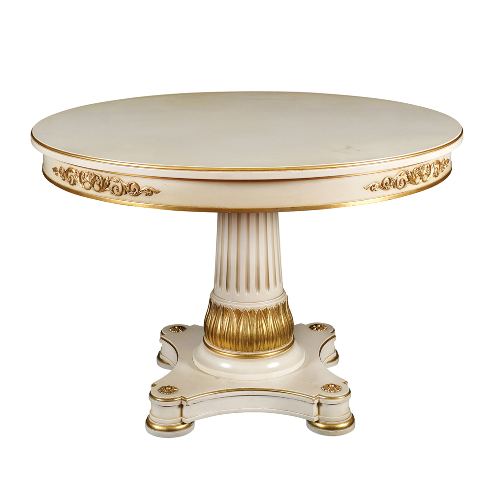 Gianni Versace home anni '90 78x110 cm. tavolo tondo da centro modello Vanitas, struttura in legno di faggio intagliato a mano con motivi vegetali, finitura laccata avorio e foglia d'oro, lievi usure