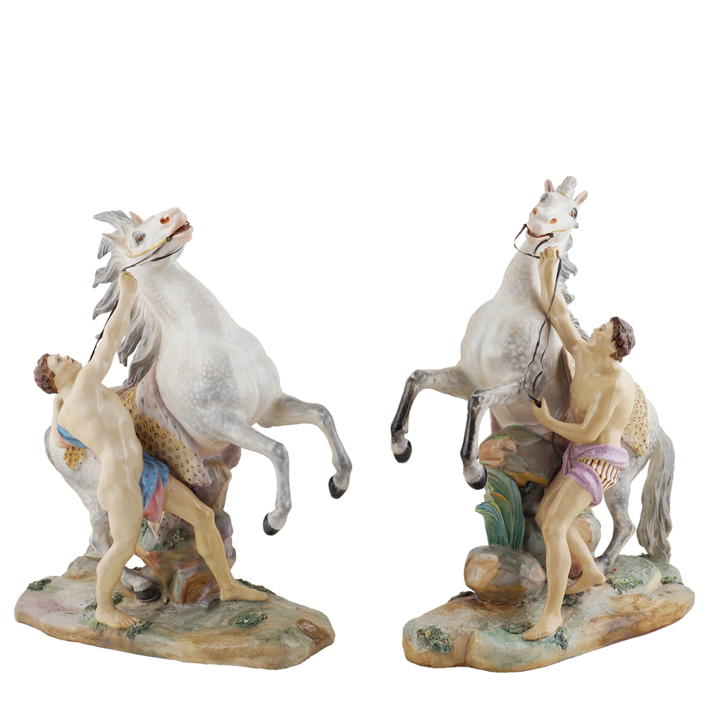 Due gruppi in porcellana policroma manifattura europea, inizio XX Sec. 56x50x23 cm. raffiguranti i Cavalli di Marly
