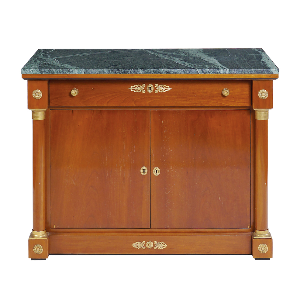 Mobile da centro in ciliegio stile Impero Francia, XX Sec. 80x101x57,5 cm. fronte ad un cassetto e due sportelli sottostanti delimitati da colonne tornite, decorato con applicazioni e pomi in bronzo dorato e cesellato, piano rettangolare in marmo verde