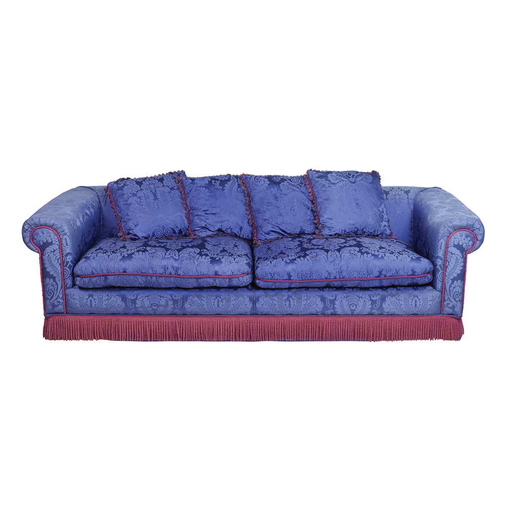 Divano tre posti XX Sec. 70x235x95 cm. interamente imbottito e rivestito in tessuto damascato blu, lievi usure