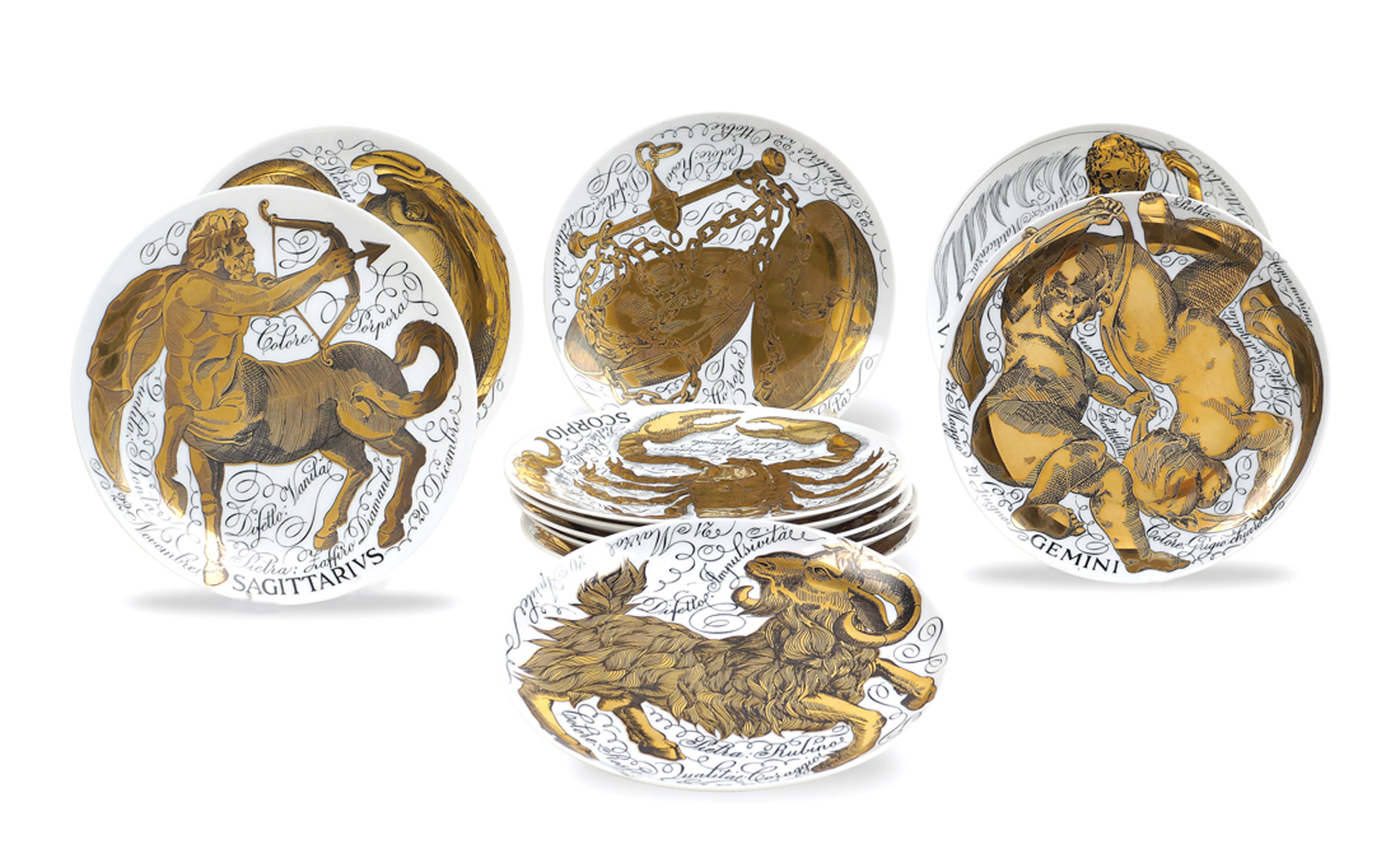 Piero Fornasetti Milano 1913 - 1988 d. 21 cm. "Gli influssi Astrali", anno 1965-1975, undici piatti in porcellana bianca decorata in oro, ogni piatto reca sul retro marchio, numero ed anno di riferimento