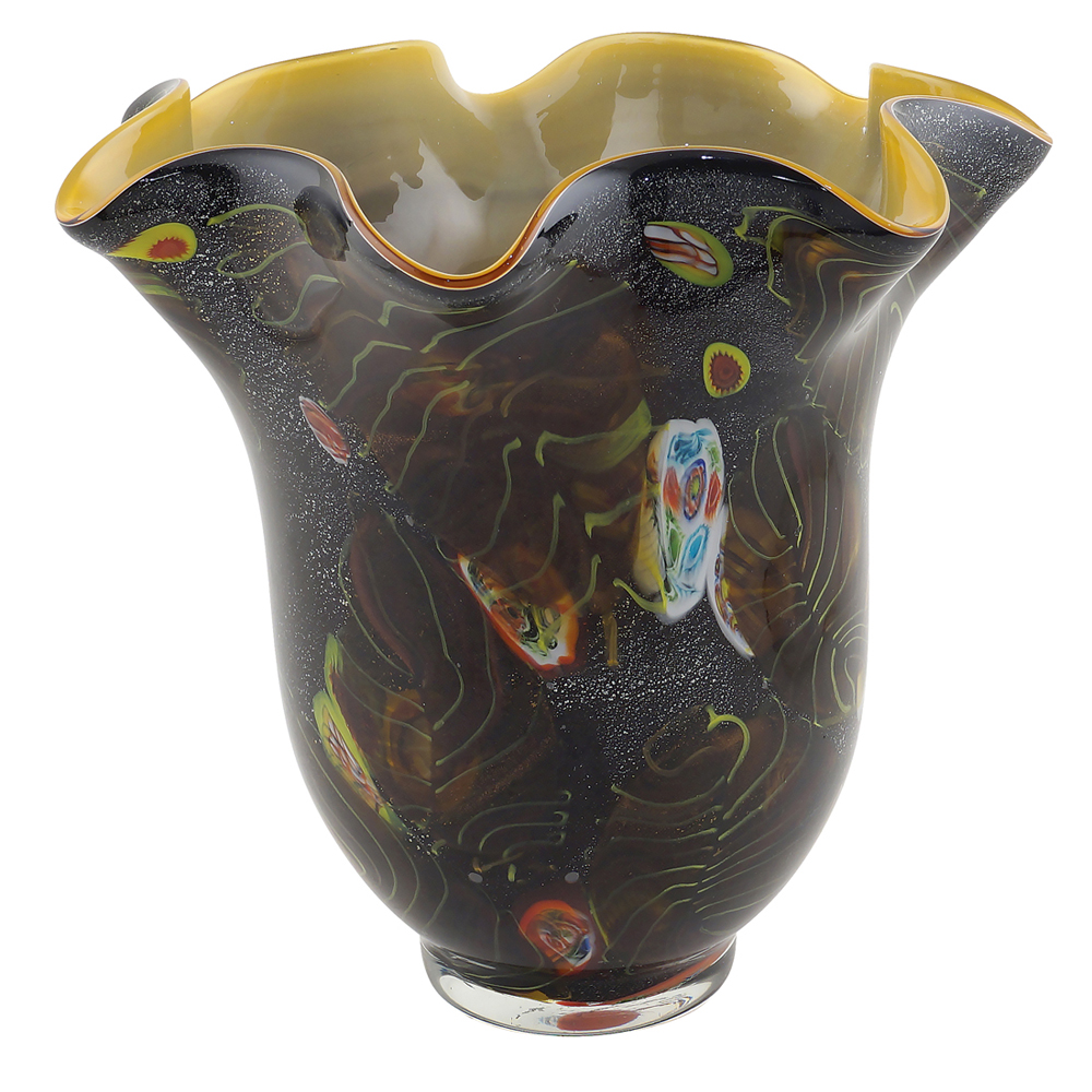 Vaso smerlato in vetro sommerso Murano, XX Sec. 39,5x42 cm. decorato in policromia con inclusioni di polvere di argento