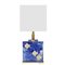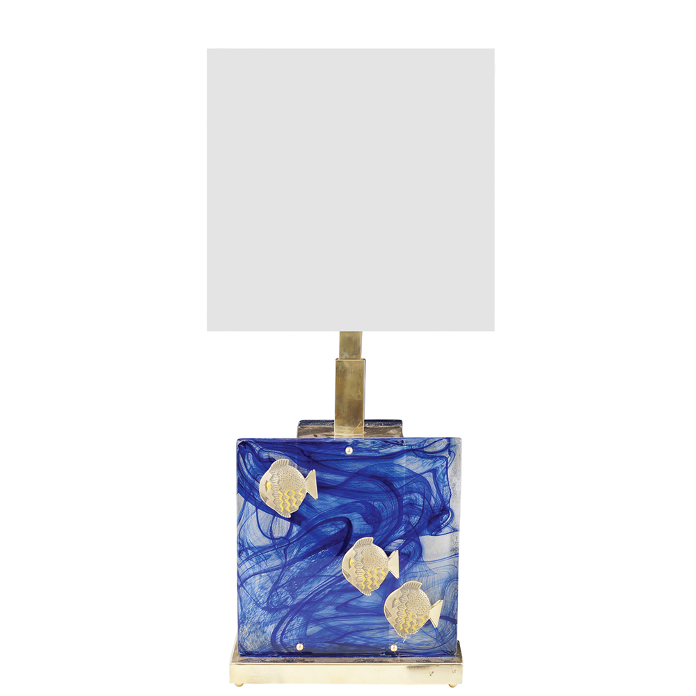 Lampada da tavolo in vetro e metallo dorato XX Sec. 62x31,5x18,5 cm. base rettangolare e stelo decorato da due placche in vetro dipinto nelle tonalità del blu cobalto con applicazioni in metallo dorato a motivo di pesce, completa di paralume