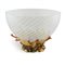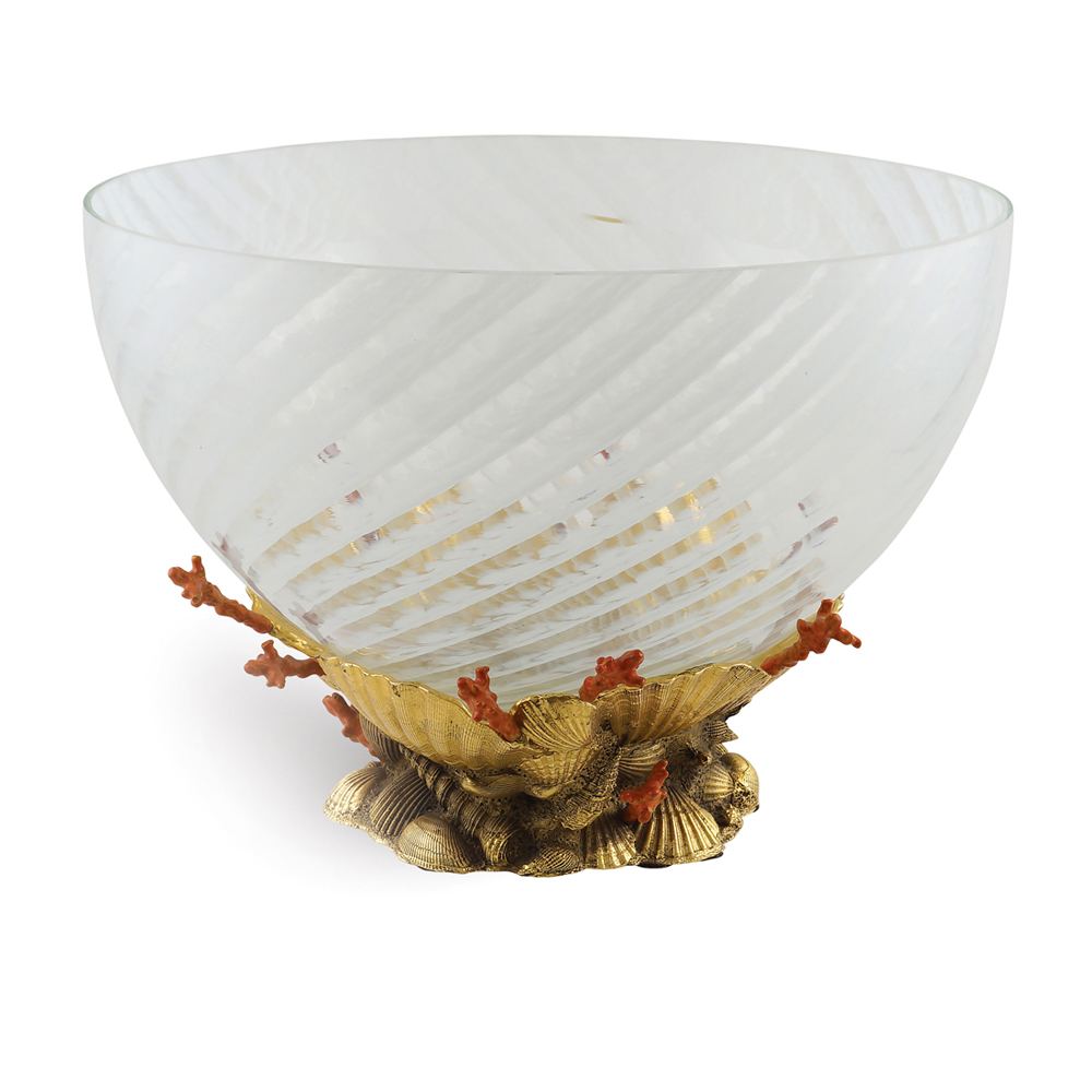 Grande coppa in vetro di Murano XX Sec. dim. 28,5x39 cm. poggiante su base in bronzo dorato scolpita a foggia di conchiglie e elementi a simulare rami di corallo rosso, firmato sulla base Regis Dho, Paris