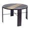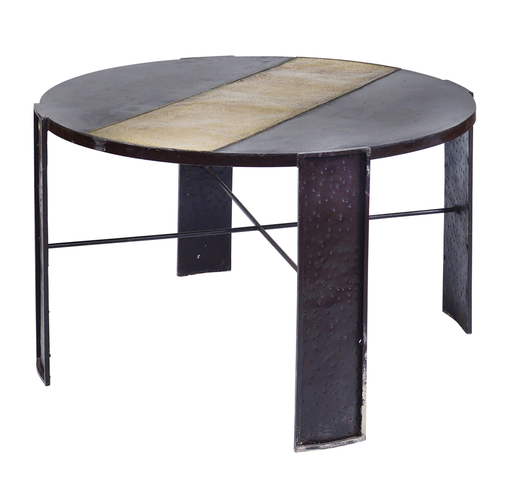 Tavolino tondo in ferro brunito XX Sec. 65x100 cm. piano circolare centrato da un inserto in rame dorato, poggiante su quattro sostegni rettangolari riuniti al centro da elementi torniti