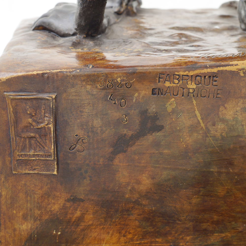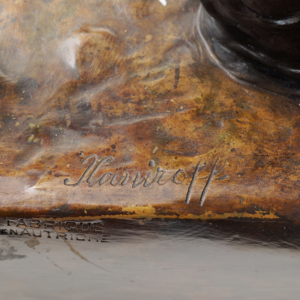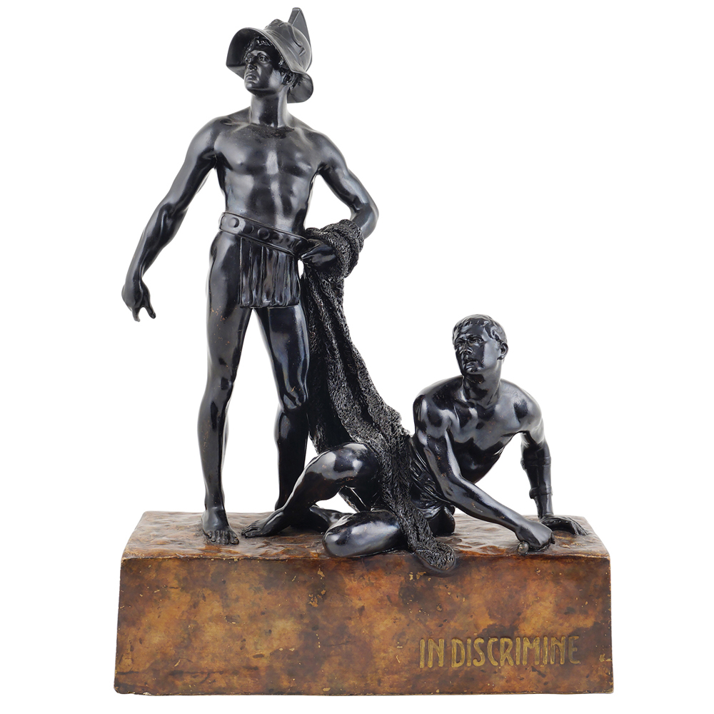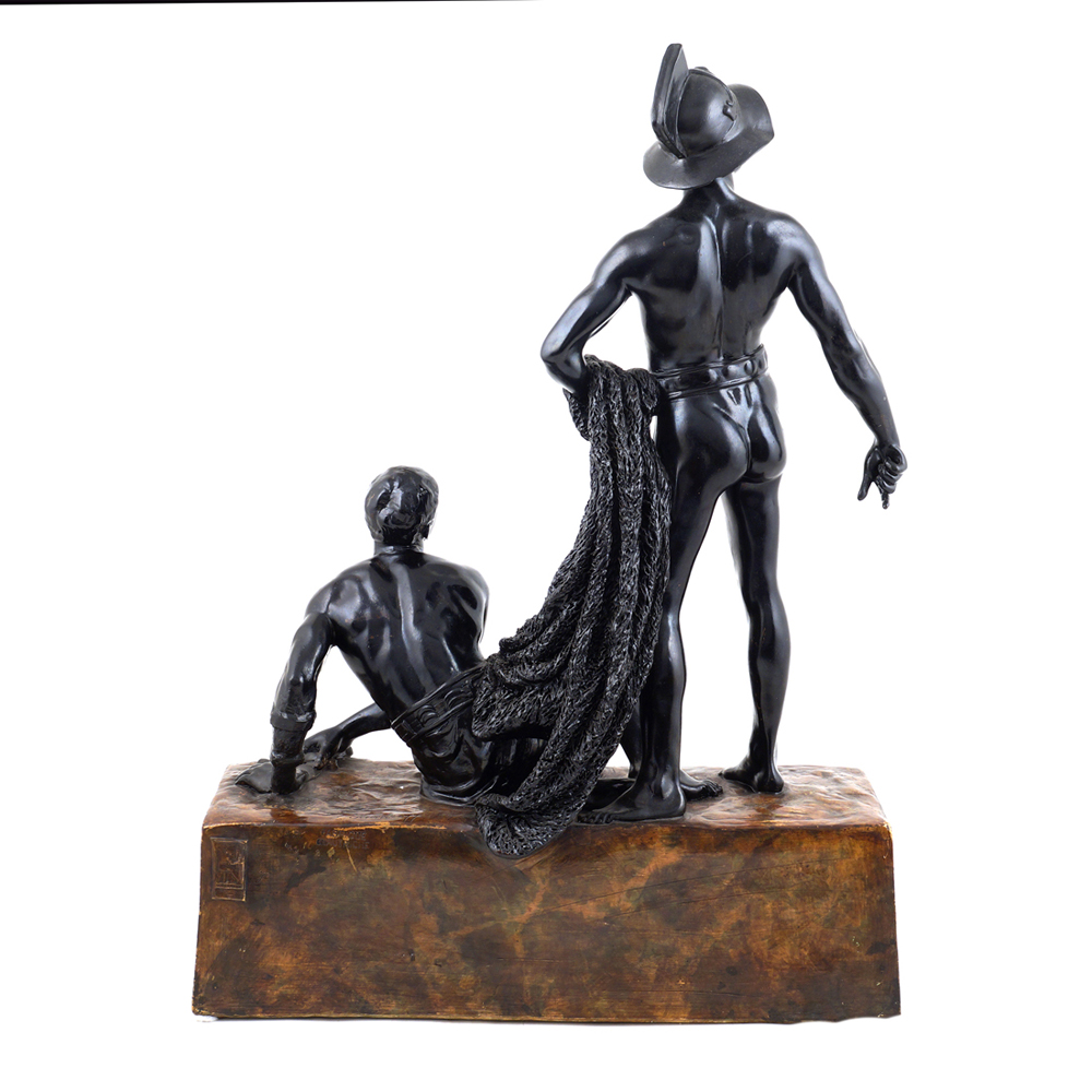 "Gladiatori", scultura in terracotta dipinta, 1915, firmata sulla base B. Haniroff, sul retro marchio della manifattura Goldscheider disegnato da Maurice Bouval (1863–1916)