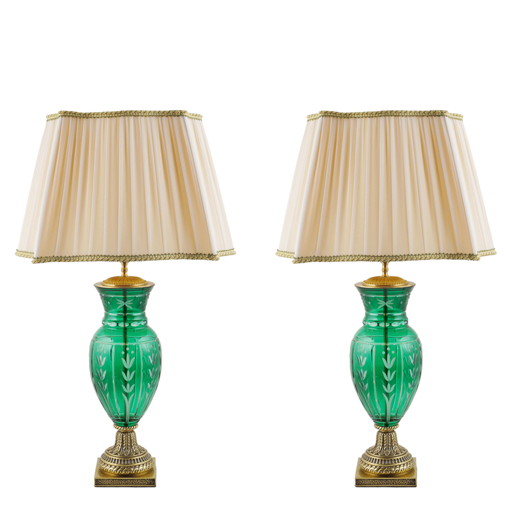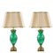 Leone Aleotti, coppia di lampade da tavolo Italia, XX Sec. h. 58 cm. stelo a balaustro in cristallo verde con base e montatura di bronzo dorato, complete di paralume.