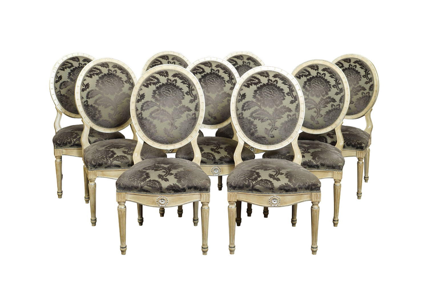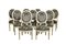 Quattordici sedie in legno laccato vecchia manifattura h. 113 cm. parzialmente argentato, sedute e schienali imbottiti e rivestito in velluto controtagliato a motivi florali