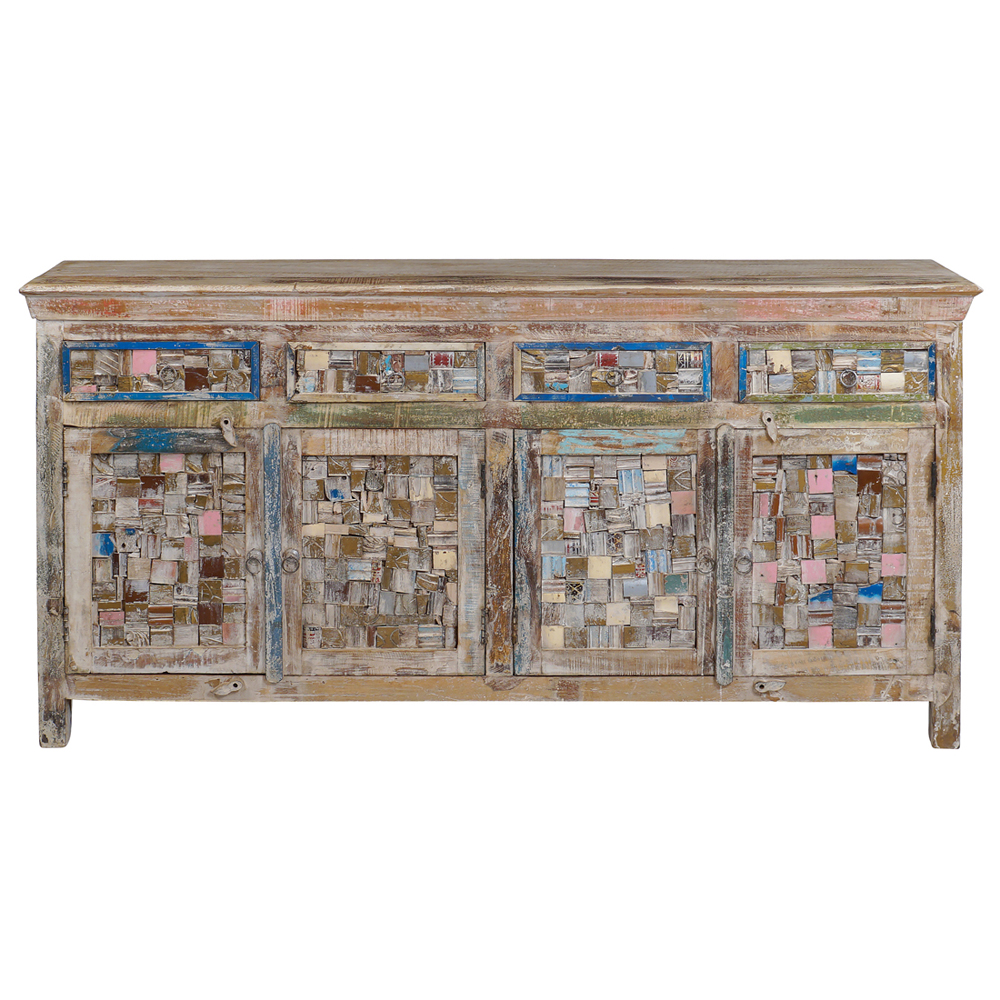 Mobile credenza in legno decapato XX Sec. 91x180x40 cm. piano rettangolare, fronte a quattro cassetti e quattro sportelli decorati in policromia
