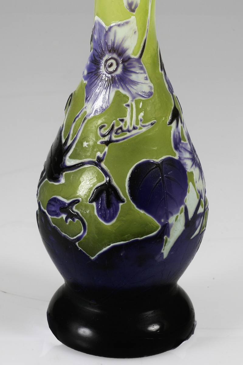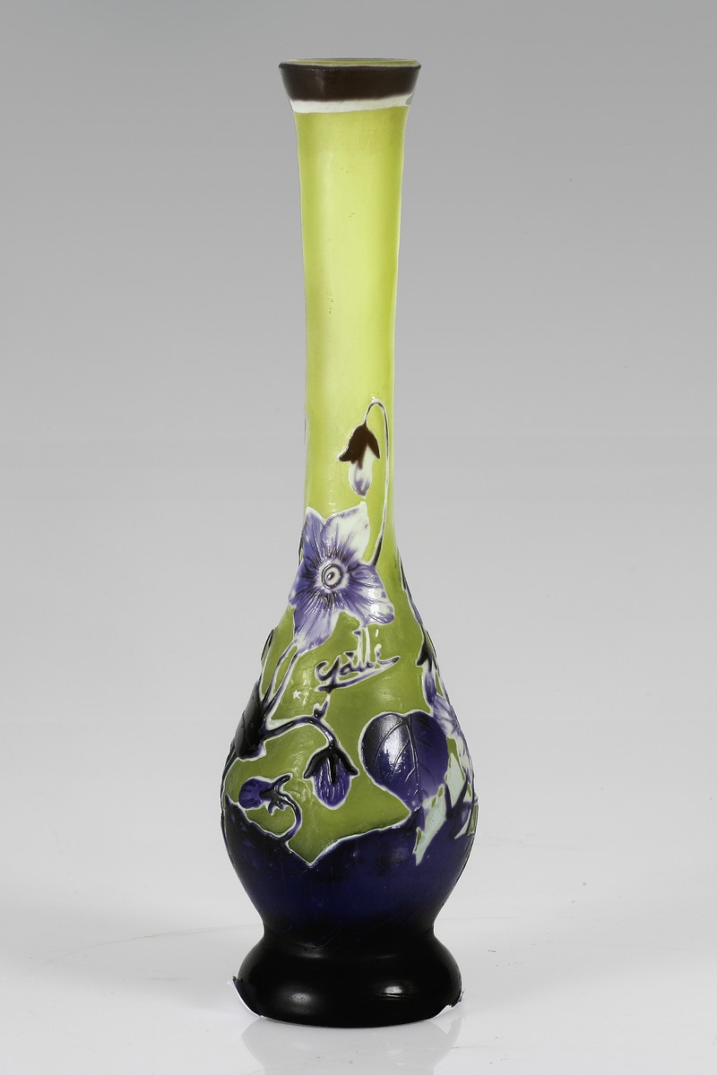 vaso soliflore in vetro doppio, riposante su base circolare, decoro di viole del pensiero e foglie finemente inciso ad acido nei toni del viola su fondo verde. Firma in rilievo a cammeo "Gallé" con la stella, epoca 1905. Autentica di Franco Borga su fotografia.