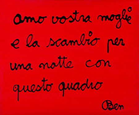 Ben Vautier Napoli 1935 Amo vostra moglie..., 2008 Tecnica mista su tela, cm. 54x65 Firmato in basso a destra. Sul verso: firma e bozzetto dell'Artista; Etichetta e timbro "Jz Art Trading", Milano, con descrizione. Autentica dell'Artista su foto. Esposizione: "Le Provocateur", JZ Art Trading, Milano, 30 settembre - 15 Novembre, 2008, pubblicata sul catalogo della mostra, Prearo editore, pag. 2, 71, 136, 137.
