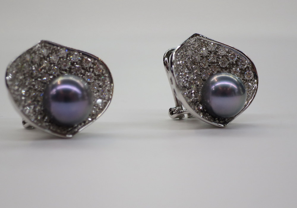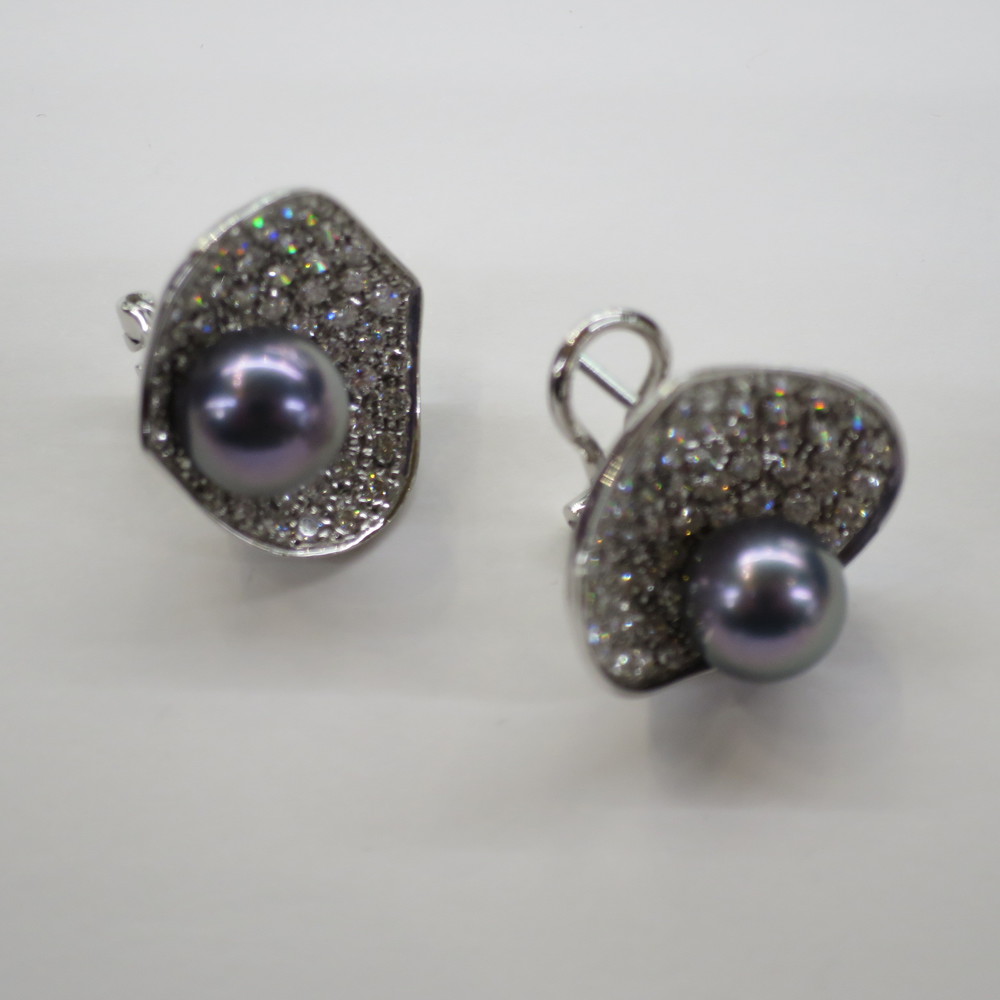 ORECCHINI, Orecchini in oro bianco con diamanti taglio brillante e perla nera mm 3,5. Ct 2,46 gr 12,00