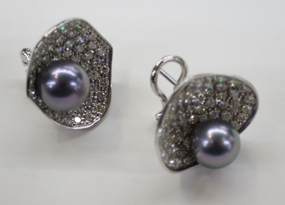 ORECCHINI, Orecchini in oro bianco con diamanti taglio brillante e perla nera...
