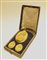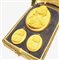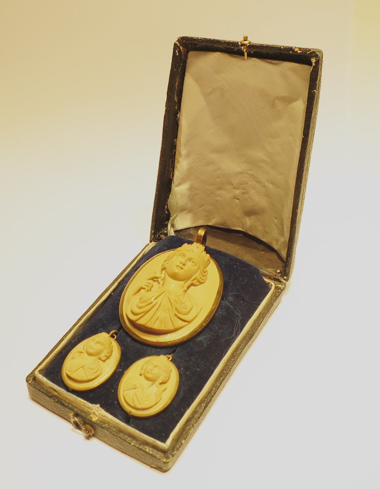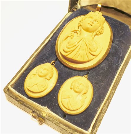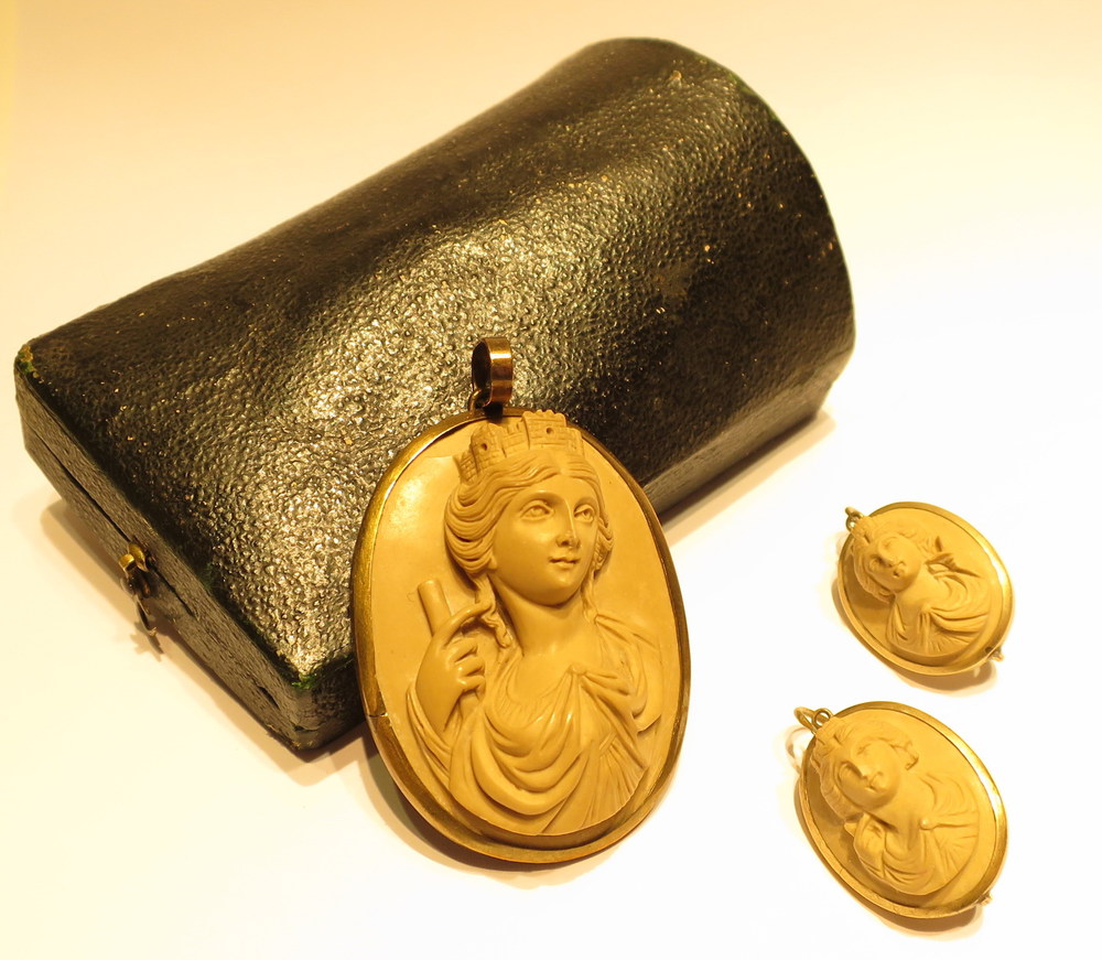 PARURE, Parure spilla e orecchini in pietra lavica raffigurante l'Italia turrita, montata in vermeil. Custodia originale.
