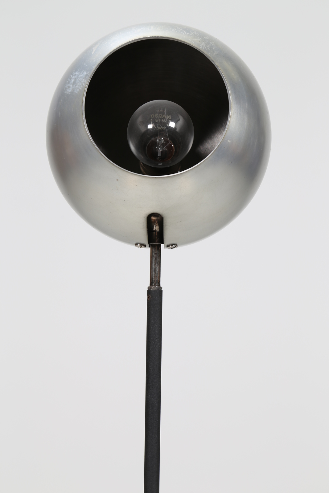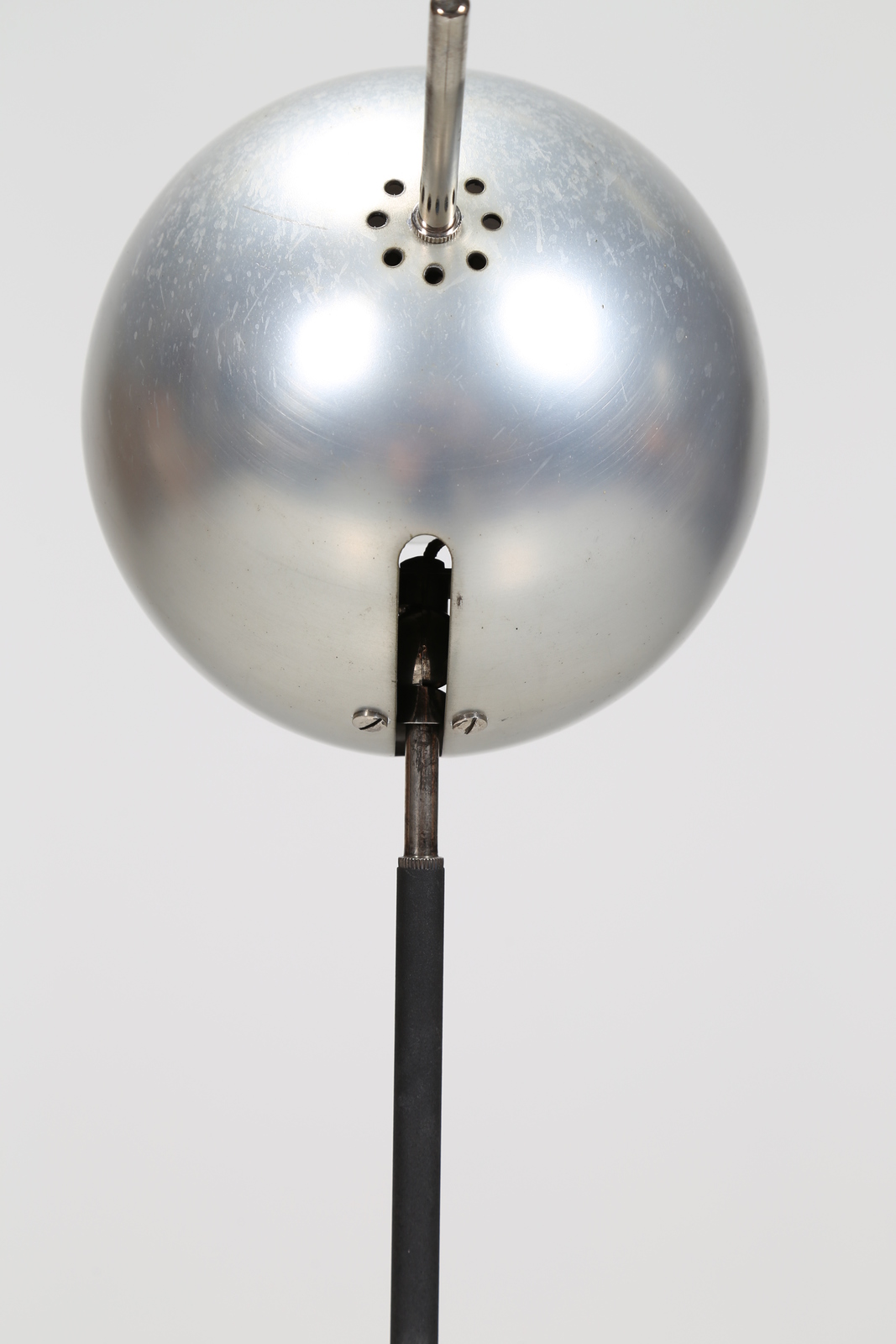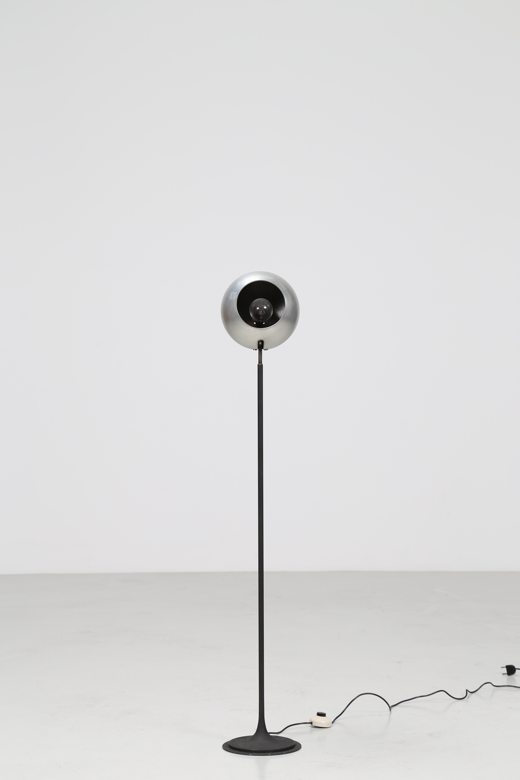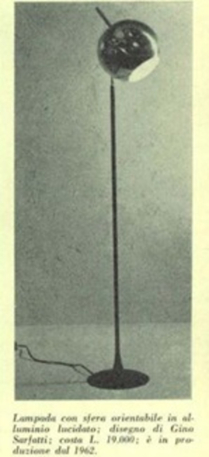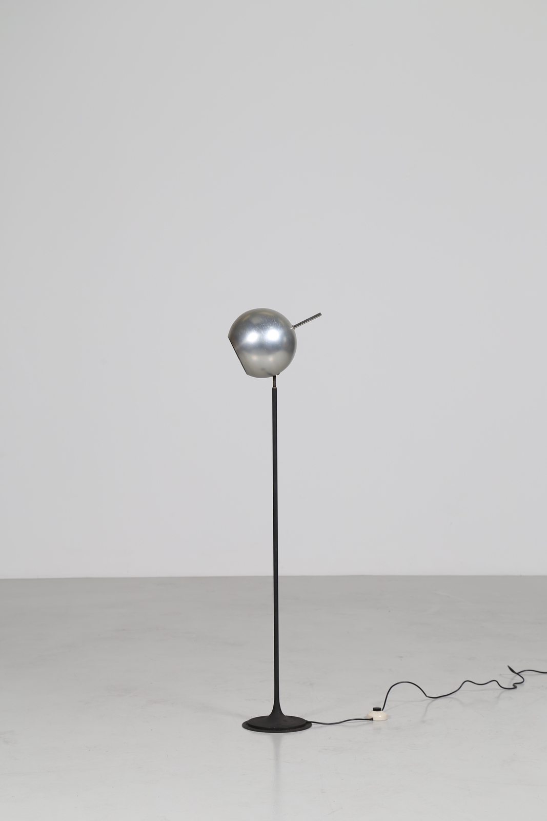 SARFATTI GINO (1912 - 1985) Floor metal lamp with a sphere adjustable and polished aluminum reflector, mod. 1082N for Arteluce 1962. Literature: Gino Sarfatti Selected Works, Romanelli/ Sever, Silvana Editoriale, pag. 456. Domus num. 404 july 1963 pag. d 143.